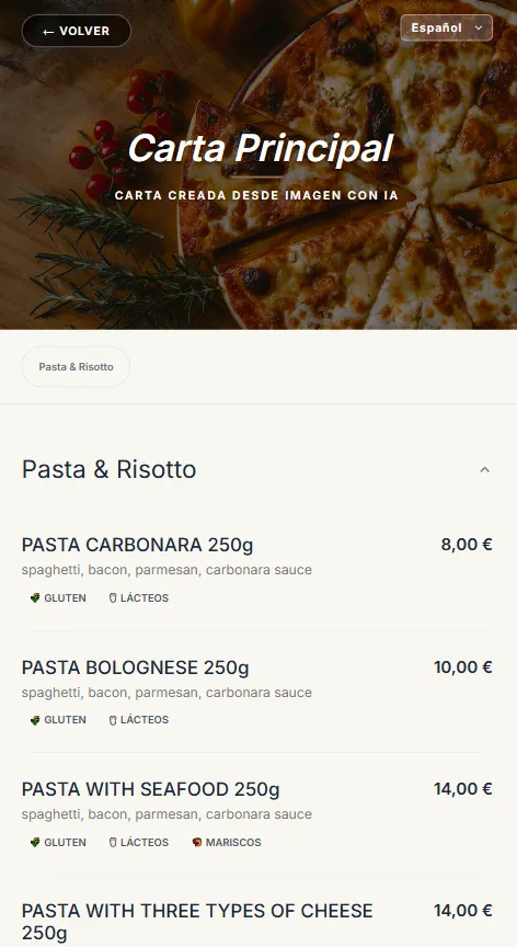 Convierte tu carta física en digital en segundos. Simplemente toma una foto y nuestra inteligencia artificial creará automáticamente tu carta digital.